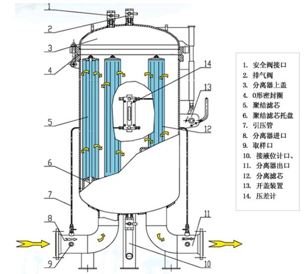 經過聚結過程的大液滴一旦形成,就必須對其進行分離。對于氣體系統,我們在濾芯中留出了一定的空間,可以控制氣體的出口流速, 防止夾帶聚結出來的液滴。
