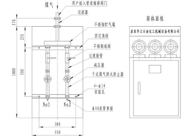 2、箱體正面板上安裝有進氣壓力表和出氣壓力表,直接監控管道壓力和使用壓力。